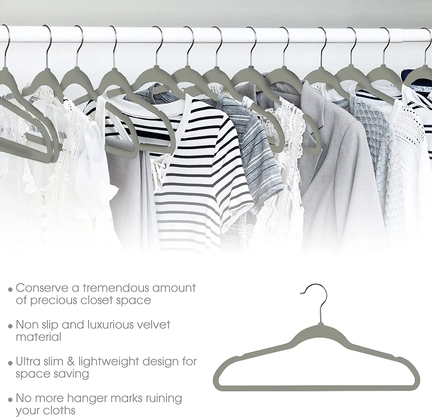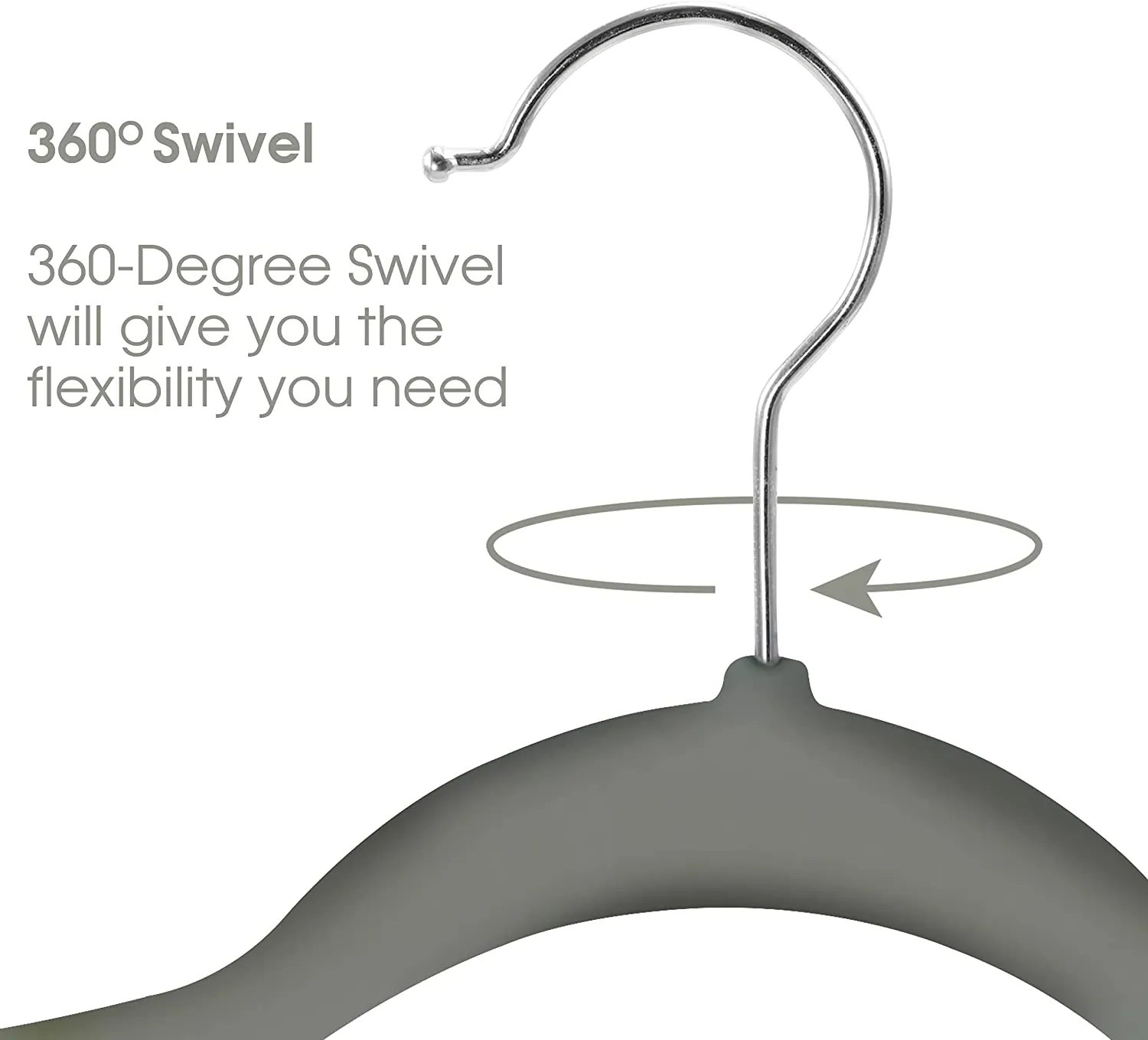 The Elama Home gray flocked velvet hangers are durable and sturdy, designed to hold clothing. It's stronger and lighter than wooden hangers, and sturdier to hold clothes without bending. These hangers are a great choice for suits, coats, skirts, shorts dresses, sweater, pants, belts, ties, shawls, thin strap shirts, tanks and women undergarments, camisoles and all your clothes. The Elama Home flocked velvet hangers feature a non slip and soft velvet feel instead of plastic or metal. It holds clothes without falling or sagging and leaving your clothes crease and wrinkle free. The contour shoulders prevents widening of the neck and clothes from slipping off the gentle yet firm non-slip surface hanger. Flocking also does not shed or fade onto your clothes, leaving your clothes looking as fabulous as the day you hung them. Why do our hooks swivel? Because each Elama Home flocked velvet hanger has a nut at the bottom of the hook so they can rotate 360 degrees by a simple twist without drop out. The designed swivel hooks enable you to sort through your clothes easily no matter which direction they hang. The swivel hooks are securely attached to the clothes hangers, so you can hang clothes and the hooks will not snap off or break. The Elama Home Flocked Velvet hanger have a 0.2" thickness, making these velvet hangers slim and sleek while you maximize and organize your closet space.