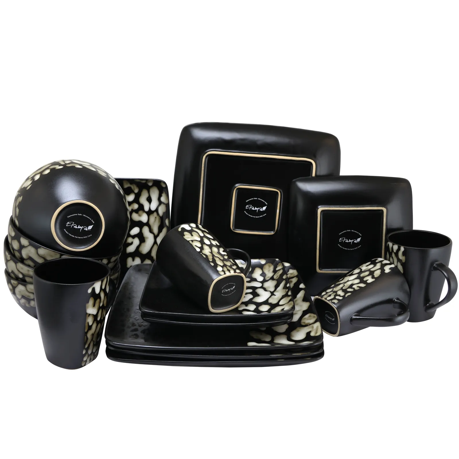 Add an extra touch of elegance to your next meal with Elamas Savannah 16 Piece Stoneware Dinnerware Set This set boasts of beautiful design and soothing colors with a beautiful animal print design Each Dinner Plate Salad Plate Mug and Bowl are decorated with an intricate animal print design These dinnerware pieces are also made of high quality stoneware making them an ideal addition to your kitchen as they are both Microwave and Dishwasher Safe allowing for easy clean up and heating up mealsMicrowave and Dishwasher SafeSet Includes4pcs dinner plates4pcs salad plates4pcs round bowls 20 fl oz4pcs cups 12 OzItem