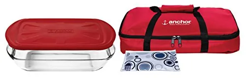A 4-piece Essentials Bake Set perfect for any kitchen. Made in Americ by Anchor Hocking. Here is what you need to get started your family's favorites today! Contains 3 Qt. Bake Dish with Red Embrace Lid and Red Carrying Tote and Hot/ Cold Pack.