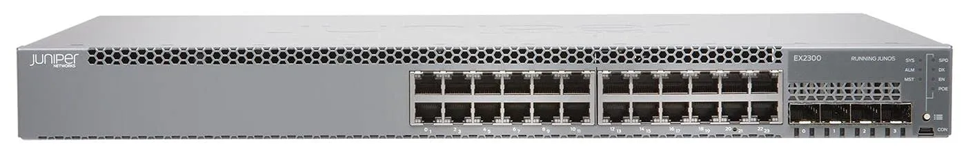 The Juniper EX2300-24P is a Layer 3 managed switch designed for high-performance networking in enterprise environments. Equipped with 24 PoE+ ports and 4 Gigabit SFP/10 Gigabit SFP+ uplinks, this switch offers flexible and robust connectivity options.