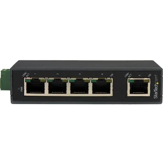 5Pt Industrial Ethernet Switch - Expand your network connectivity with this rugged unmanaged network switch - Fast 10/100Mbps Switch - DIN rail mountable with built-in bracket - Robust IP30-rated housing - Wide range 12-48V DC terminal block input - IEEE 802.3az Energy-Efficient Ethernet - Wider range of operating temperatures and ideal for industrial environments - Store-and-forward switching mechanism - Supports IEEE 802.3x flow control and back pressure.