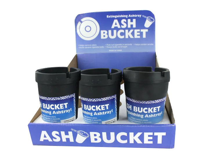 Put out cigarettes in seconds and help contain smoke, remove odors and keeps butts out of sight with this durable plastic Extinguishing Ashtray Ash Bucket. Screw-on lid has 3 indented cigarette holders. Each ashtray is approximately 4 1/4" tall and the diameter of the lid is 3 1/8". Countertop display comes with 12 pieces.