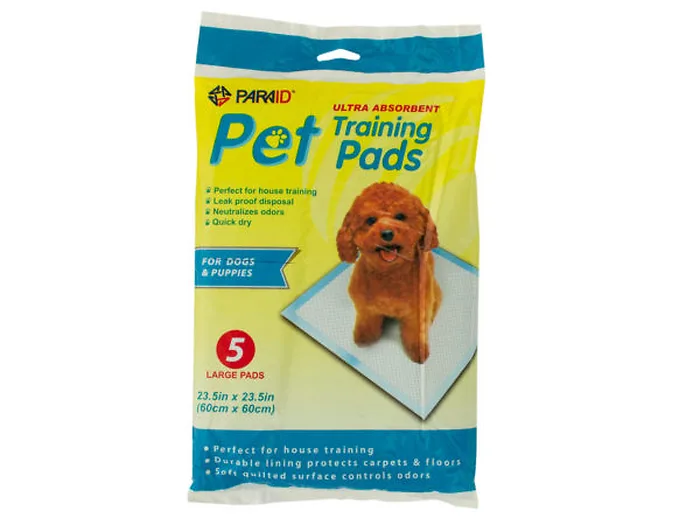 Our Extra Large Ultra Absorbent Puppy Training Pads are ideal for house training puppies and adult dogs. This 5-piece set features fast-drying pads with a soft quilted surface designed to effectively control odors. The durable linings safeguard your carpets and floors from spills and messes. Each pad measures approximately 23.5" x 23.5", making them perfect for any dog size.