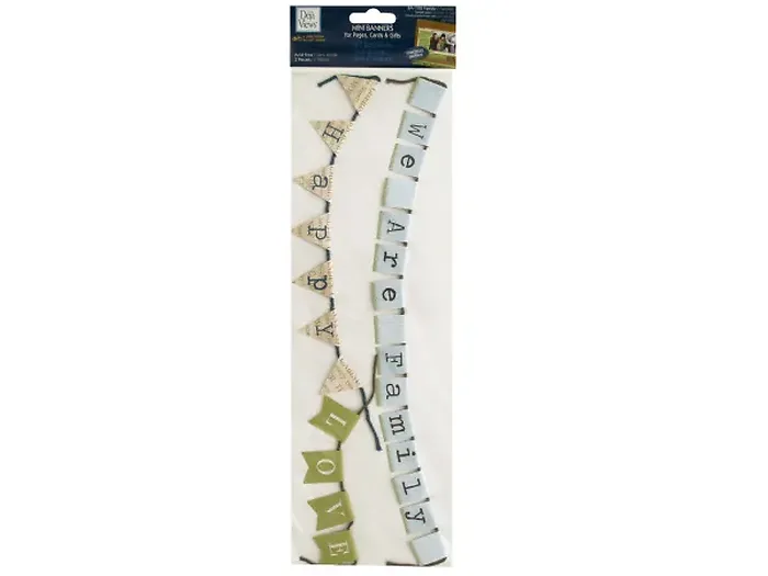 Perfect for scrapbooking, decorating cards and gifts and general craft use, this 3-piece Family Mini Banners with Embossed Accents Set features a mini banner that spells out "We Are Family" in light blue squares, a mini banner that spells out "Happy" on beige flags with text print and a mini banner that spells out "Love" on green flags. All pieces hang with cotton strings. Acid free.