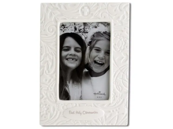 Perfect for any tabletop, this First Holy Communion Porcelain Photo Frame features a decorative floral white ceramic frame with the words "First Holy Communion" at the bottom and a glitter cross at the top. Frame accommodates a 4" x 6" photo and has a folding table stand on back. Measures approximately 8.75" x 6.375". Comes loose.