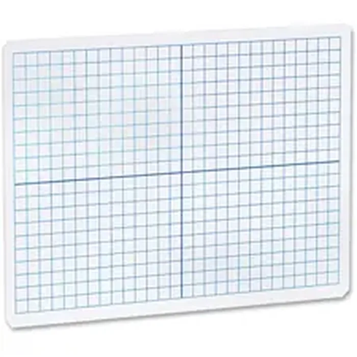 Unframed, dry-erase board offers a blue XY axis grid on one side and plain dry-erase surface on the other. Bold lines separate board into quadrants each 14 squares by 10 squares. The total grid is 28 squares by 20 squares. Individual squares measure 3/8" x 3/8". High-quality, dry-erase coating will not ghost. Board features rounded corners and smooth edges for comfort and safety. Durable hardboard backing is warp-resistant and chip-resistant.