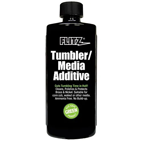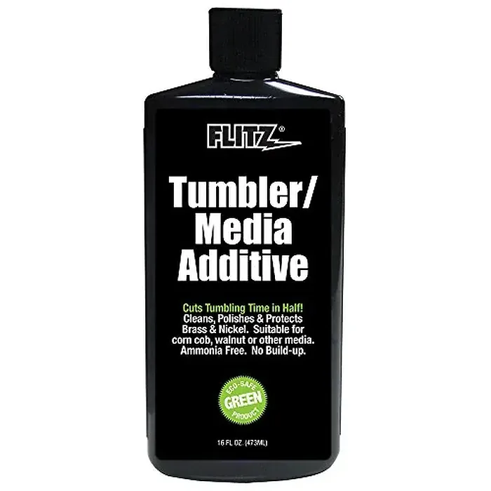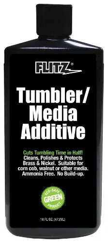 Tumbler/Media Additive - 16 oz. BottleFlitz Tumber/Media Additive will not harm ANY METAL or Primer. Will not stress brass. No Ammonia. No Buildup. Suitable for corn cob, walnut or other media. Cuts tumbling time in half. Cleans, polishes & protects brass & nickel. Eco-safe product.