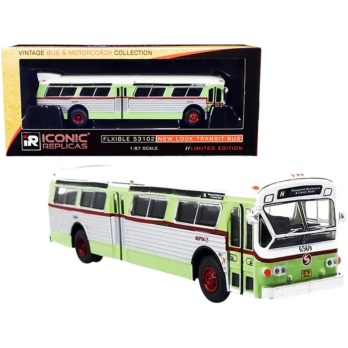 - Brand new 1/87 (HO) scale diecast model of Flxible 53102 Transit Bus #N "Roosevelt Blvd. & Comly Road" SEPTA Philadelphia (Pennsylvania) Light Green and Silver with White Top "Vintage Bus & Motorcoach Collection" die cast model by Iconic Replicas.