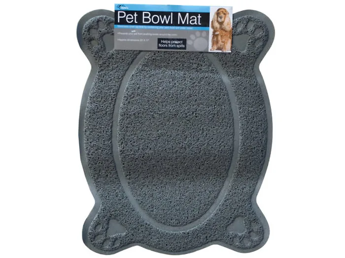 Eliminate clean-up time by containing your pet's food and water mess with this Four Paw Pet Bowl Mat featuring a cushioned plastic mat in an oval shape with a paw at each corner. Unique surface traps messes - simply shake the mat to clean. Measures approximately 23" x 17". Comes packaged with a hanging panel.