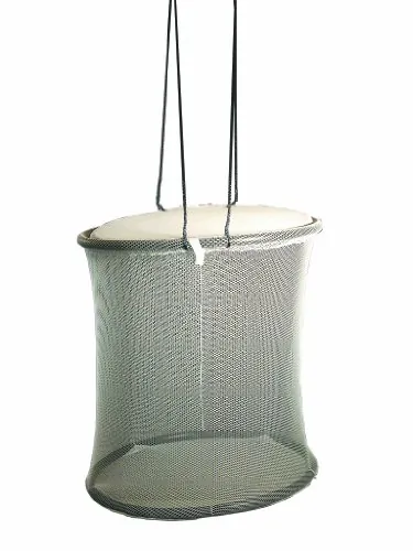 A handy natural container for bait or for storing your game fish. Tie a Bait Quarters to a dock or boat slip and keep any fish healthy for extended periods. The cleverly designed buoyant top keeps the lid handy for easy access. Weighted bottom maintains a cylindrical shape even in stiff currents. A Velcro latch keeps pesky birds out. The soft 3/8 white nylon mesh is strong enough to keep fish yet gentler than traditional wire or metal boxes. Made from non-corrosive materials for a lifetime of fresh or saltwater use. Collapses for easy storage. Check state regulations for use guidelines.