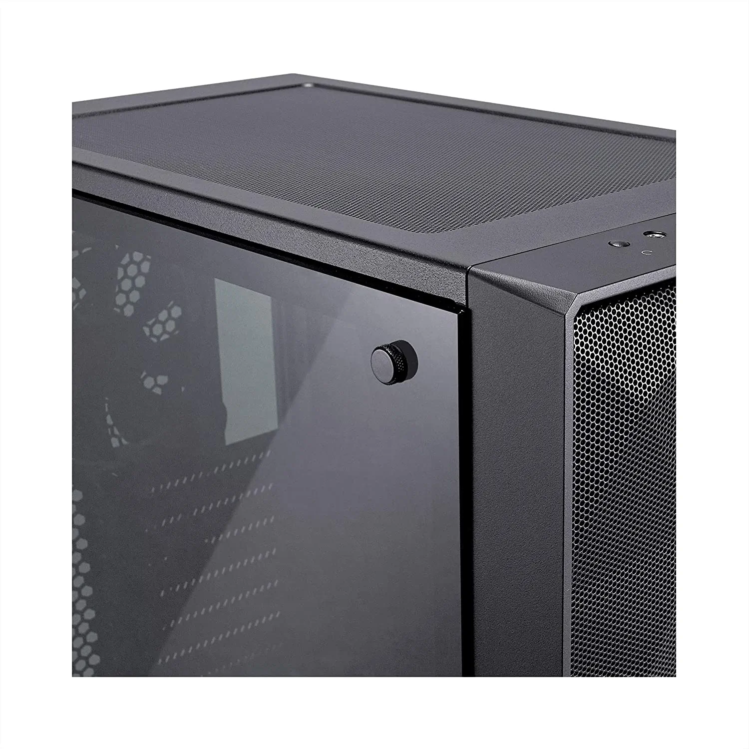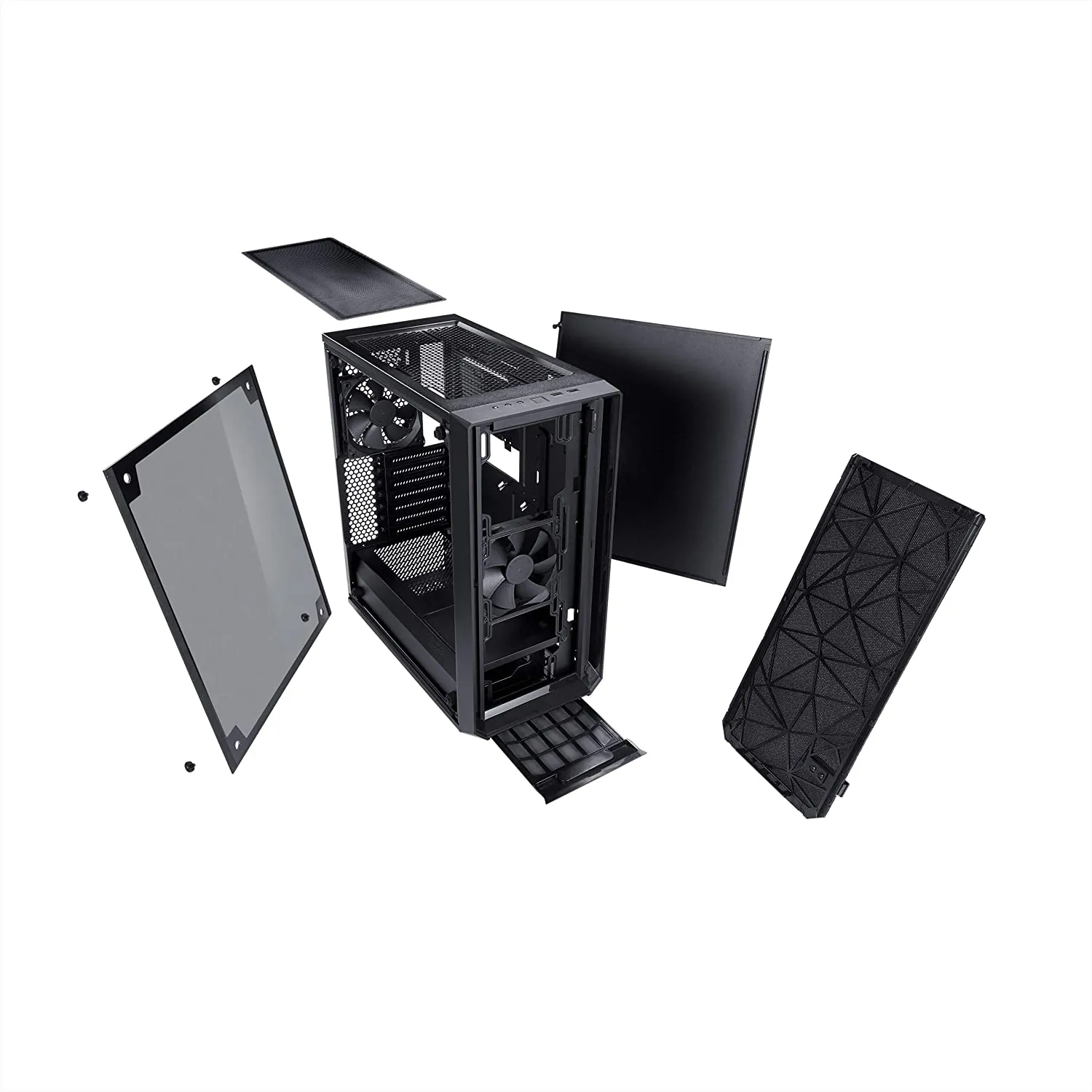 Meshify strikes an aggressive pose in the Fractal Design lineup with unparalleled cooling performance and a defiant new look. Like black diamond facets, the angular asymmetry of the Meshify C carves a space uniquely its own as a new force in high-airflow design. Tempered glass with a distinctive tint completes the stealth-inspired black-on-black aesthetic with exceptional style. A compact yet spacious open ATX layout creates an unrestricted airflow path from front intakes directly through key components to exhaust, ensuring heat is never an issue. When performance is top priority and compromise is not an option, Meshify has you covered in style
