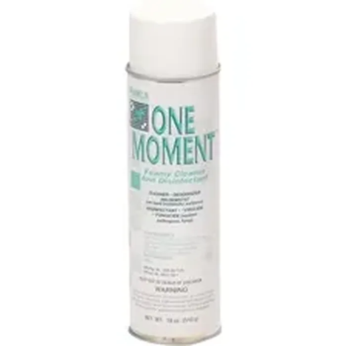 One Moment Foamy Cleaner and Disinfectant cleans, deodorizes, disinfects and brightens hard, nonporous surfaces and fixtures in one easy application. Use on walls, floors, sink tops, metal surfaces, glazed porcelain, plastic, baked enamel and more in hospitals, nursing homes, schools, hotels, homes and food-processing establishments. This disinfectant/virucide/fungicide/mildewstat is effective against a broad range of pathogens and in preventing cross-contamination. It is not for use on critical and semi-critical medical device surfaces. EPA-registered aerosol spray with a citrus fragrance and 12.0 pH deodorizes those areas that generally are hard to keep fresh smelling, such as garbage storage areas, empty garbage bins and cans, toilet bowls and other areas prone to odors caused by microorganisms.
