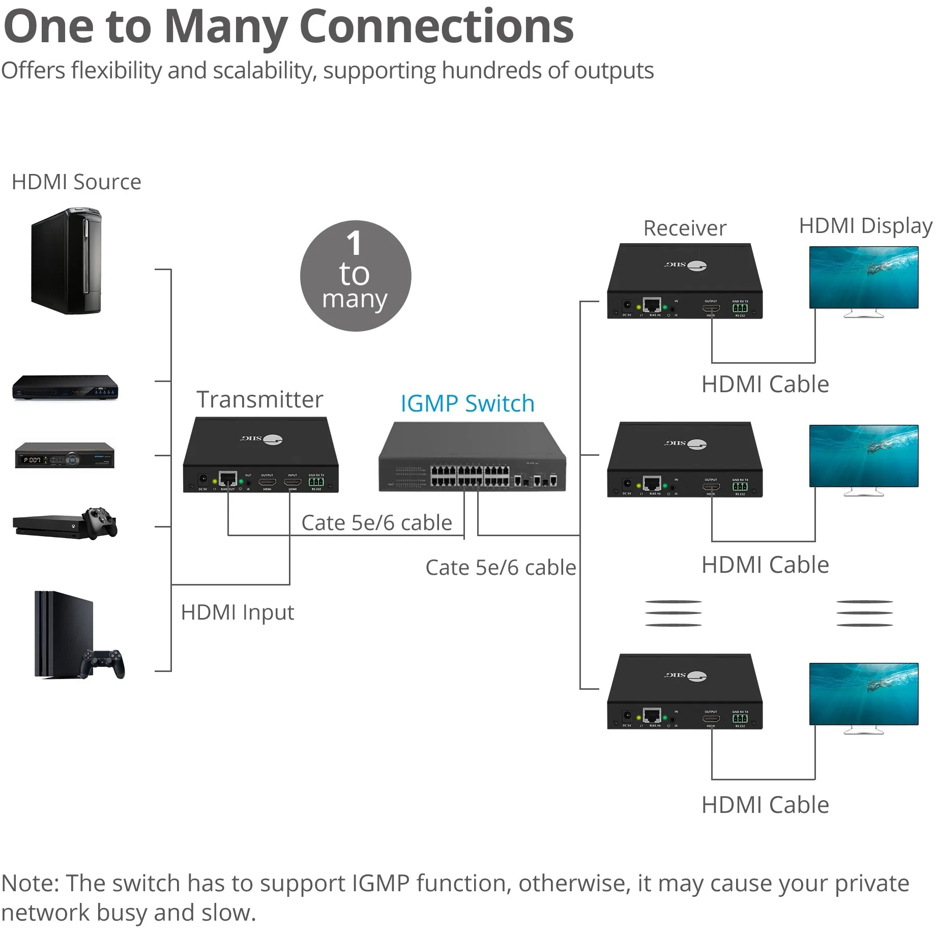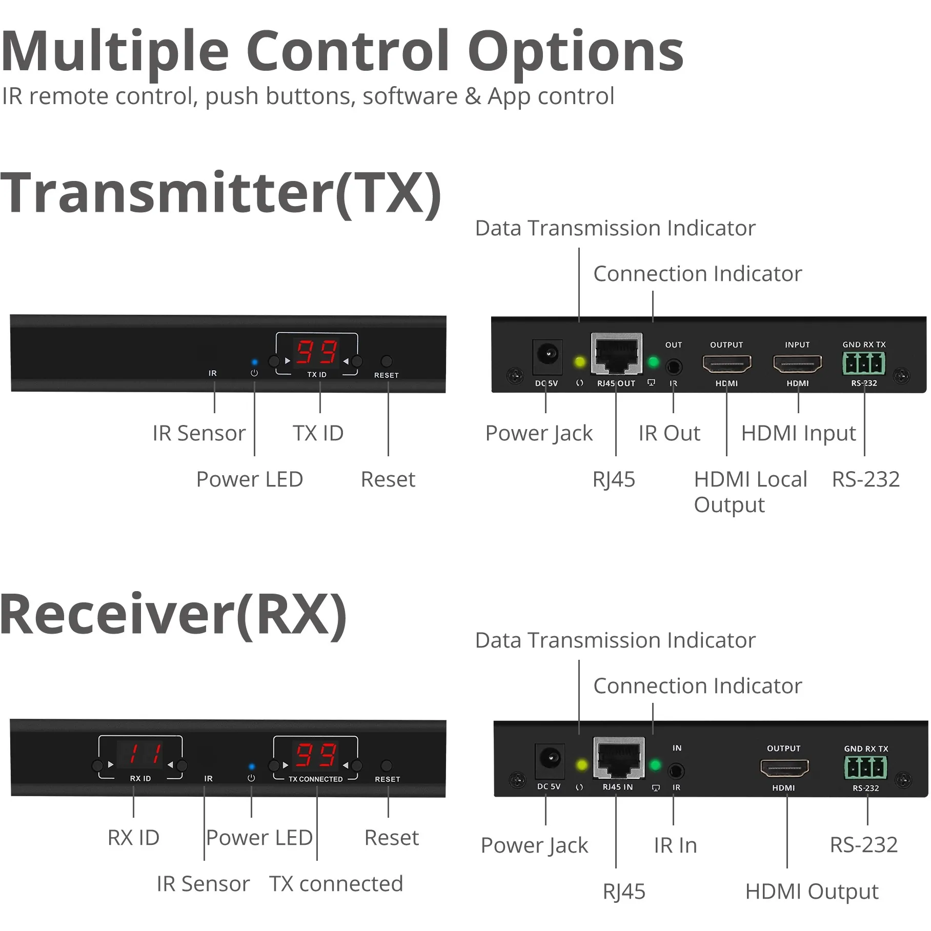 HDMI cable length: Up to 5m (Input and Output) Supports 2-Ch PCM stereo audio Supports full frequency IR signal from 20KHz to 60KHz Housing material:
