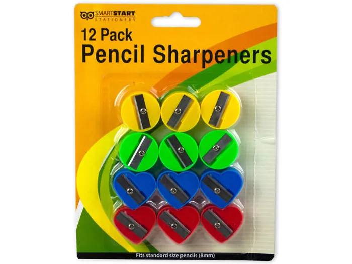 Perfect for home, school or office, this 12-piece Fun Shape Pencil Sharpeners Set features sharpeners with durable plastic bodies in circle and heart shapes with metal blades. Sharpeners fit standard size pencils (8 mm). Circle sharpeners are approximately 1" in diameter. Heart sharpeners are nearly 1 1/4" wide. Not recommended for children under 3. Comes packaged in a blister pack.