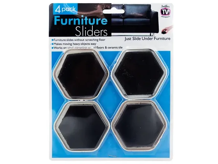 Great for protecting floors from scratches and damage, this 4-piece Furniture Sliders Set features hexagon-shaped plastic and foam sliders that work on carpet and tiles and make moving heavy objects easy. Each slider measures approximately 3.35" x 3". Comes packaged in a blister pack.