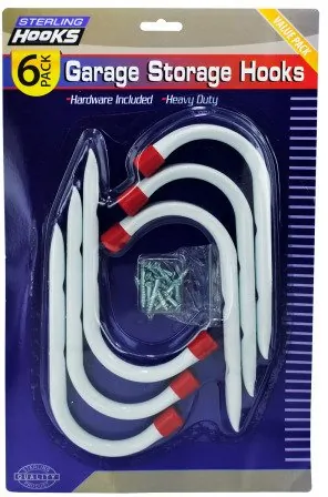 Save space and your sanity with this set of garage storage hooks! This value pack comes with 6 large garage hooks that are great for organizing bikes, bags and more. Every pack comes with 6 metal hooks along with the necessary hardware. Hooks measure approximately 6" long with a 3" hook section. Comes packaged in a blister pack.
