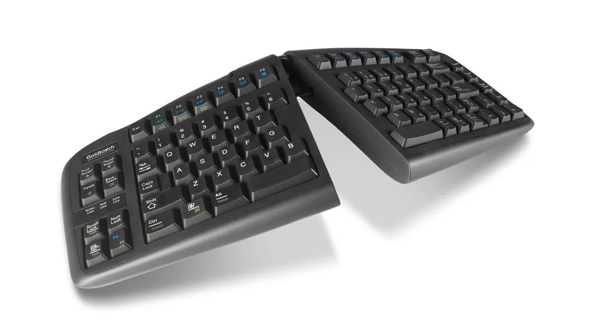 The Goldtouch V2 Adjustable Ergonomic USB Keyboard is designed to provide maximum comfort and efficiency for both PC and MAC users. With its adjustable design, you can customize the angle and position to fit your ergonomic needs, helping to reduce strain during extended typing sessions.