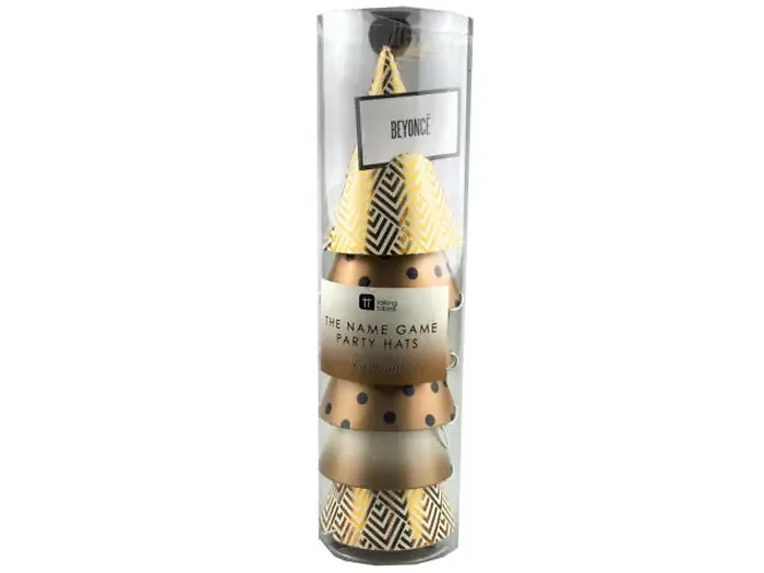 Packaged in a convenient plastic cylinder that is 10" tall and 3" in diameter, it makes for an easy and fun activity at any gathering. Challenge your friends and family to see how quickly they can identify the famous names while wearing a silly hat!
