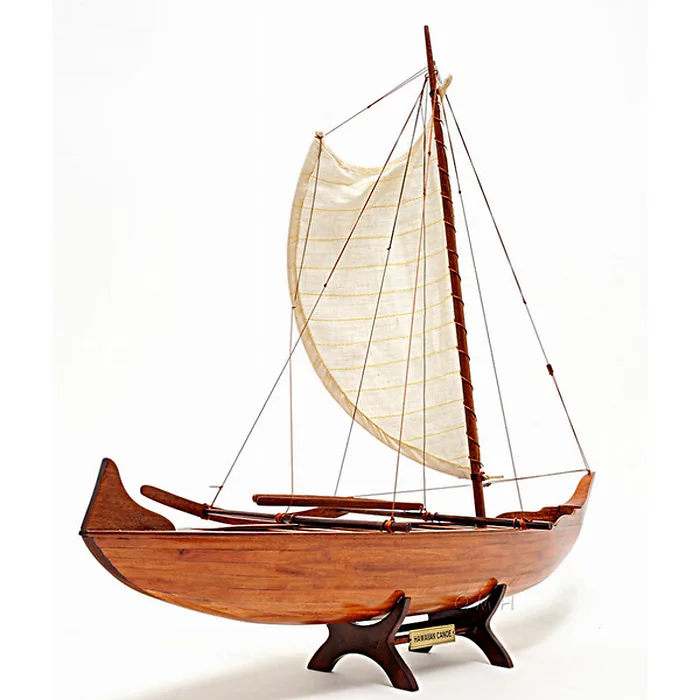 In the early 1900s outrigger canoe racing became a popular sport in Hawaii. Have this beautiful Hawaiian canoe model display in your own home or office. Master craftsmen handcraft these highly detailed wood models from scratch using historical photographs, drawings and original plan. They are built to scale with high-grade wood such as: western red cedar, rosewood, and mahogany. They are 100% hand built individually using plank-on-frame construction method and are similar to the building of actual ships. Each model requires many hours to finish and must go through a demanding quality control process before leaving the workshop. This model was constructed by putting together many strips of wood. It rests on a wooden stand with a brass nameplate. It will be a perfect gift for home or office decorator, boat enthusiast, or passionate collector. Mast and sails are folded down for easy shipping.Country of Origin - US