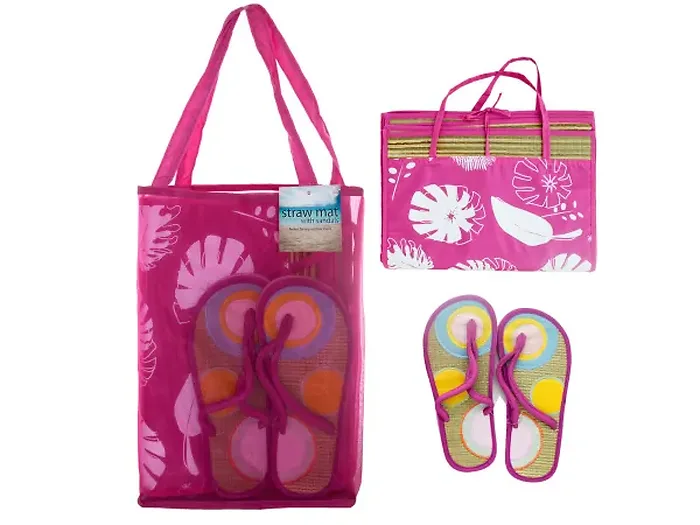 Additionally, this set features stylish sequined thong sandals with comfortable woven straw foot beds, available in assorted colors and sizes to suit your personal style. All items come packed in a sheer nylon carrying bag with handles for effortless transport.