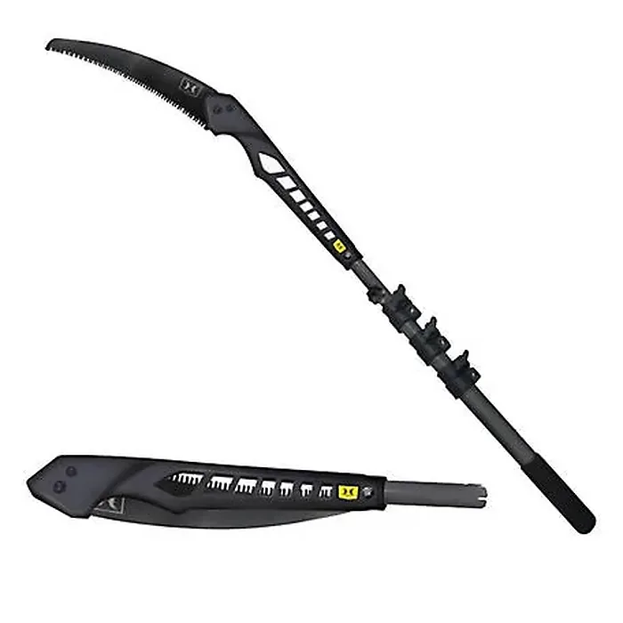 The HAWK 8FT Aluminum Telescopic Pole Saw is designed for efficient tree trimming and cutting. It features an 11-inch SK5 high carbon steel blade with patented teeth design for enhanced cutting performance. The black titanium nitride finish not only provides corrosion resistance but also allows for smoother cuts. This lightweight pole saw includes a durable casting aluminum head with a sleek black powder coating for added longevity and strength.