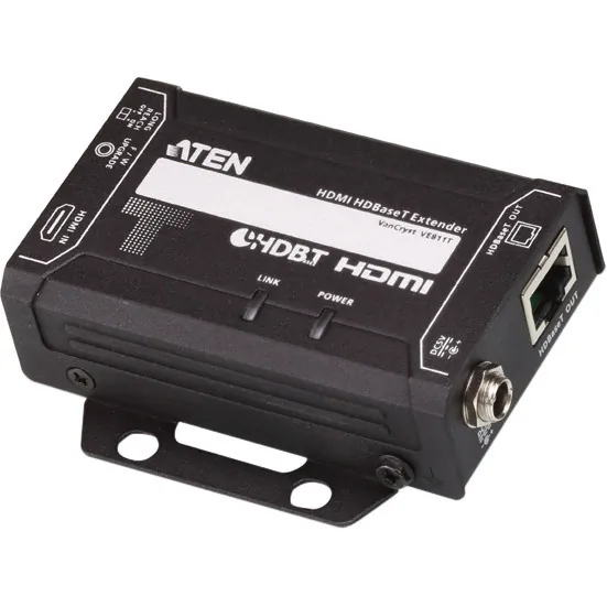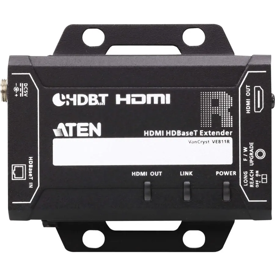 General InformationThe ATEN VE811R HDMI HDBaseT Receiver guarantees the optimum HDMI connection up to 100 m over a single Cat 5e/6/6a or ATEN 2L-2910 Cat 6 cable. The VE811R meets HDMI Specification features including 3D, Deep Color, HD lossless audio formats and CEC pass through. It supports Dolby Digital 5.1, DTS HD audio and video signals at resolutions up to 4K. Pushing the technology and design to the limit, the compact design makes the VE811R easy to mount in any location. Engineered for today's digital trends, the VE811R is ideal for meeting rooms, or any setting that requires high quality HDMI video to be extended for great distances.Technical InformationConnectivity Technology: WiredNumber of Output Devices Supported: 1Maximum Operating Distance: 328.08 ftVideoGraphics Modes: 4KMaximum Video Resolution: 4096 x 2160Interfaces/PortsNetwork (RJ-45): YesHDMI Out: YesNumber of Network (RJ-45) Ports: 1Number of HDMI Outputs: 1Media & PerformanceMedia Type Supported: Twisted PairTwisted Pair Cable Standard: Category 6Physical CharacteristicsColor: BlackReceiver Height: 0.97"Receiver Width: 2.87"Receiver Depth: 3.40"Form Factor: Rack-mountableReceiver Weight (Approximate): 6 ozMiscellaneousPackage Contents: HDMI HDBaseT Receiver 1 x Power Adapters 1 x User Instructions Environmentally Friendly: YesEnvironmental Certification: RoHSEnvironmental Certification: WEEEWarrantyLimited Warranty: 2 Year