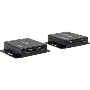 Manhattan HDMI Extendor Kit extends HDMI connection up 164 ft. between an HDMI source and an HD monitor or projector, using one ethernet cable. The 2-port (1 HDMI, 1 Ethernet) transmitter allows HDMI signals to be sent over Ethernet and split to local display simultaneously. Supports video amplifier bandwidth up to 340 MHz and 3.40 Gbps per channel (10.2 Gbps total) for 1080p displays. Wideband IR transmit and receive cables allow for convenient remote control of HD signal source. Fully HDCP compliant to protect high-definition content transmission and ensure quality reception. Plug and play requires no installation or configuration. Works with Playstation and Xbox game systems, Blu-ray players, set-top boxes, satellite receivers and more. Gold-plated contacts for corrosion free connections. For additional distance capabilities, use 15m HDMI cables on both transmitter and receiver. Three-Year Warranty.