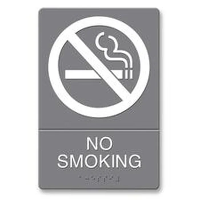 Durable plastic sign displays a raised pictogram, grade II Braille, and reads, "No Smoking" in all caps. Sign complies with Americans with Disabilities Act by including tactile characters and grade II Braille, meeting size specifications and indicating the placement specifications on the package. Attach to walls or doors using the included adhesive backing for easy application.