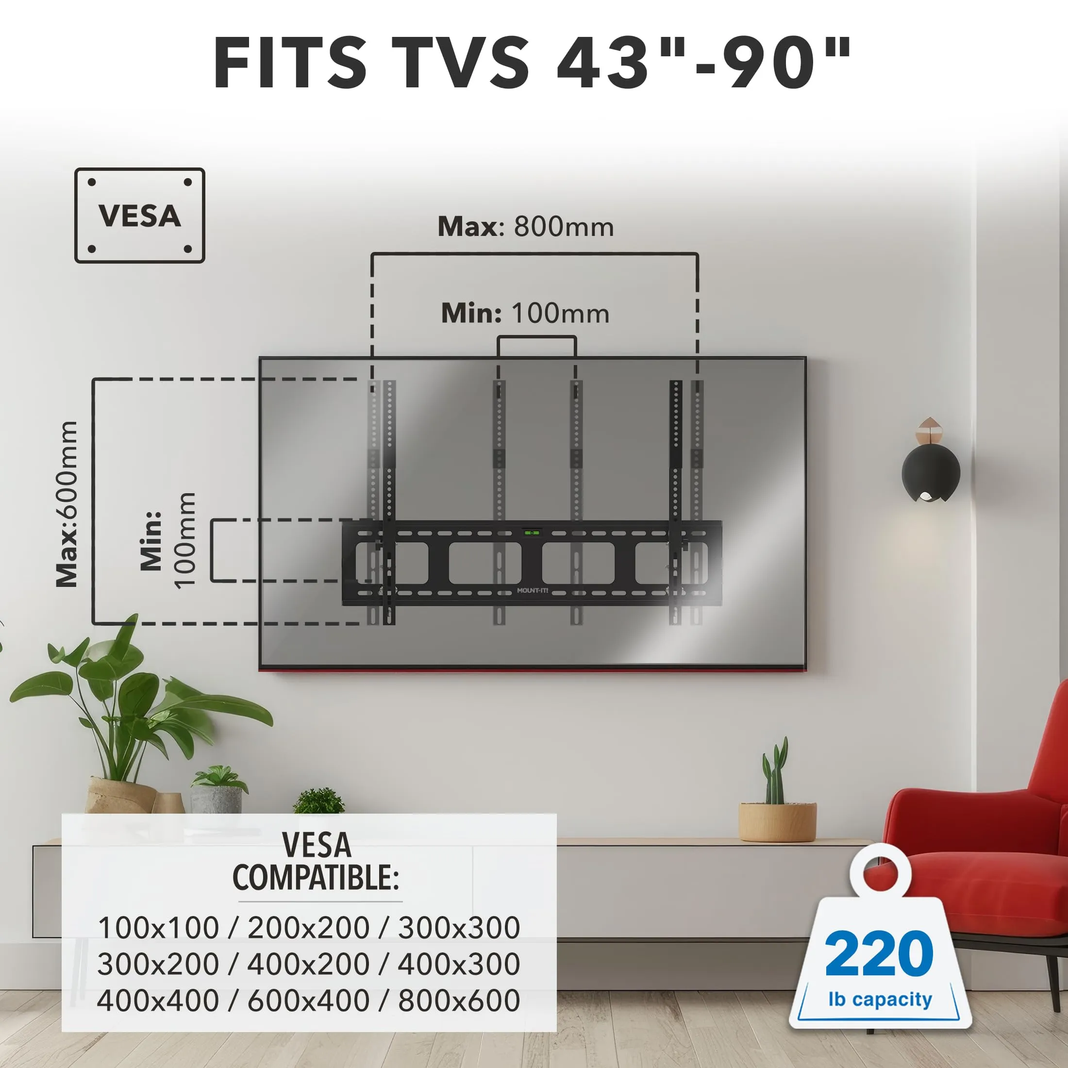 - Supports TVs from 43 to 90 inches and up to 220 lbs
