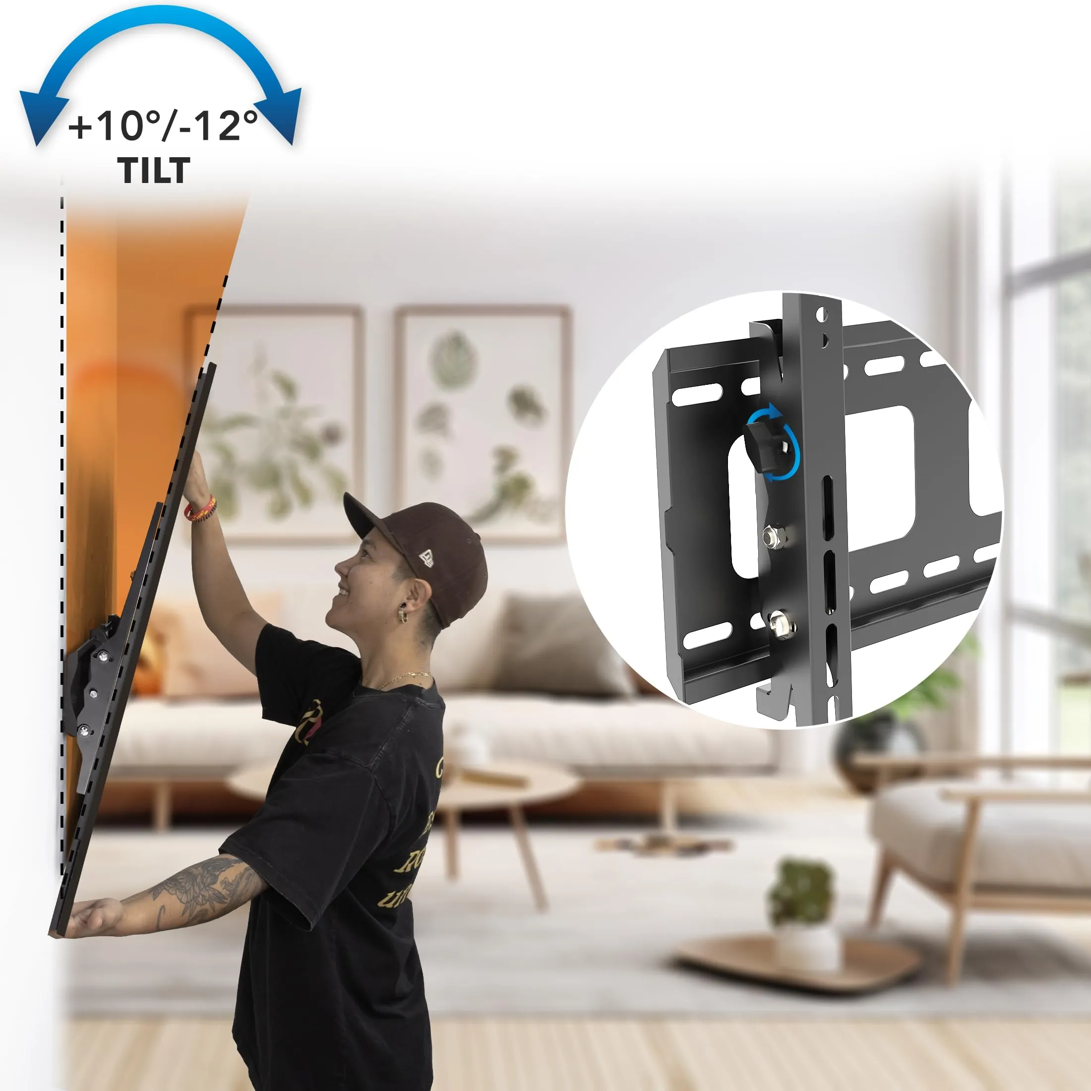 Tilt your TV 10° up or 12° down to minimize glare and achieve the optimal viewing angle for ultimate comfort. With VESA compatibility from 100x100 to 800x600, it accommodates a wide variety of TVs, allowing for hassle-free installation.