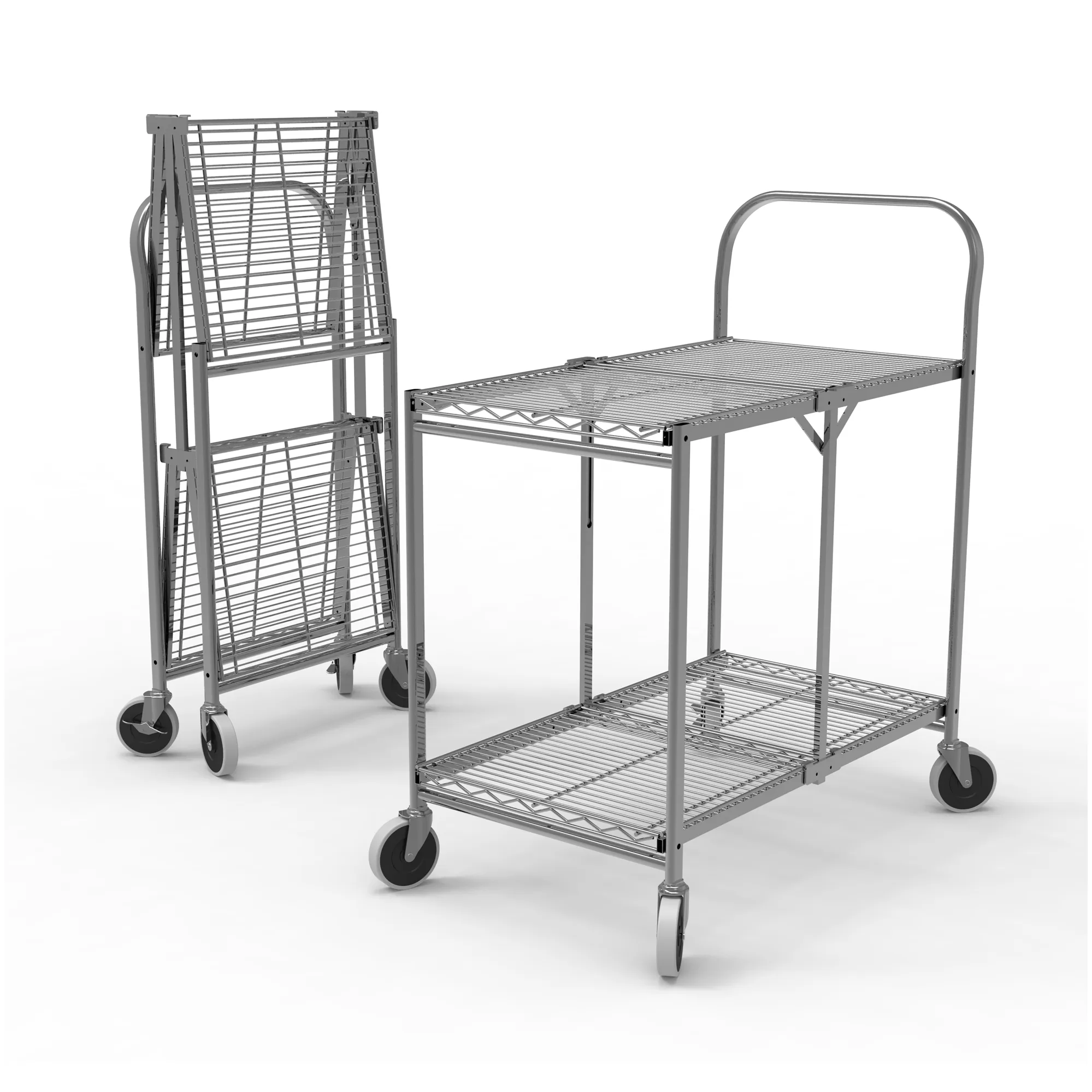 Discover the functionality and sturdiness of the Heavy-Duty Two-Shelf Collapsible Utility Cart, perfect for restaurants, kitchens, cafés, and other commercial environments. Built with robust steel and featuring an anti-corrosion chrome finish, this cart can easily support loads up to 200 lbs. Its foldable design allows for convenient storage and transport when not in use. The open design enhances ventilation and minimizes dust accumulation, making it ideal for various storage and transport needs.