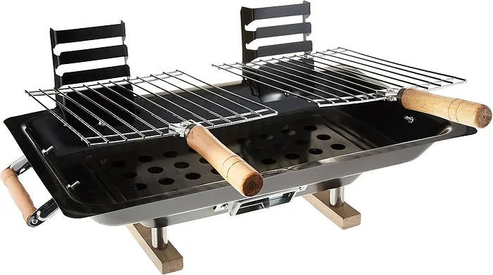 Perfect for barbecuing on small balconies, patios and decks, this sturdy metal Hibachi Grill features adjustable dual cooking grates, an adjustable air vent for controlling charcoal burn rates and wooden handles for easy carrying. Measures approximately 9.5" x 17". For outdoor use only. Includes directions for assembly. Comes packaged in an individual box. Box measures approximately 17.5" x 2.25" x 10.25".