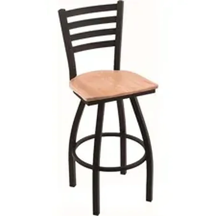 This Jackie swivel bar stool has a contemporary design and provides superb back support. The frame is made from commercial-quality steel that is strong and durable, and is powder-coated to ensure a long-lasting, rich finish. Wood seat is made of 1-1/4" hardwood that's dished for comfort. The framework itself is sturdy and uses only solid mig welds to ensure the integrity of the structure. Bar stool supports up to 350 lb.