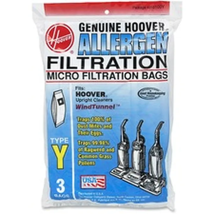 Filtration vacuum bags are designed for high filtration of common household allergens, trapping 99 percent of dust and pollens down to 5 microns. Type Y Allergen filtration fits Hoover upright vacuums, including the Hoover WindTunnel Commercial Clean-Air Upright Vacuum and other WindTunnel uprights that use Type Y or Type Z bags.