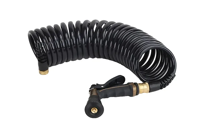 The HoseCoil Commercial Pilot PRO 20 feet Hose Kit offers a durable and high-performance solution for marine and industrial applications. The 20-foot black PRO Series coiled hose is constructed from premium High Performance Polyether material, ensuring excellent durability and UV resistance in harsh environments. Its 4.75 coil design allows for flexibility and compact storage, while dual strain reliefs minimize kinking during use. The 1/2 inch inner diameter provides a 30% increase in flow rate compared to standard 3/8 inch hoses, enabling efficient water delivery for various tasks. Built with 3/4-inch garden-style brass fittings, the hose connects seamlessly to all standard US hose connections and is designed for easy repairs with common hand tools, making maintenance straightforward and cost-effective. The thicker hose wall enhances strength and longevity, making this hose a reliable choice for demanding use. The kit includes a Boat Bumper Metal Body Nozzle, designed with a large rubber tip to protect gelcoat and boat surfaces from damage during spraying. Its adjustable spray pattern adapts from a wide-angle rinse to a focused stream, suitable for removing stubborn debris or gentle rinsing. The nozzle's solid brass spray mechanism combined with a sturdy metal body and stainless steel components ensures long-lasting performance and precise flow control. Additionally, the quick release brass swivel fitting maintains proper nozzle alignment when attached to the hose and allows for effortless removal or repositioning. This comprehensive kit is ideal for marine, industrial, or commercial use where durability, flow efficiency, and surface protection are critical.