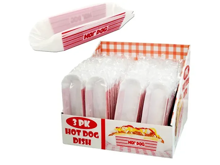 Enjoy hot dogs without the mess with these fun plastic dishes featuring a retro look with red stripes and the words "HOT DOG". Each dish fits a standard size hot dog bun. There are 3 dishes per bag and there are 80 bags per display. The total dishes per display is 240 pieces.