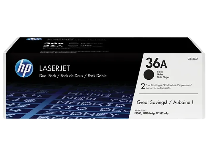 Toner cartridge is designed for use with HP LaserJet P1505, P1505n, M1120, M1522n MFP and M1522nf MFP Printers. Spherically shaped particles produce bold, crisp text and sharp images. With the patented toner formula, you get consistent results at fast print speeds. Avoid downtime with the legendary quality and reliability of Original HP toner cartridges. Built-in intelligence helps you manage supplies proactively; you have the supplies you need when you need them. Each cartridge yields approximately 2,000 pages. HP 36A (CB436D) Original Toner Cartridge - Dual Pack