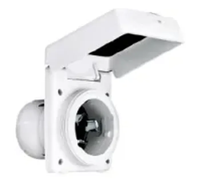 Stylized non-metallic shore power inlet has UV resistant white Centrex cover which makes unit weatherproof when completely closed. Interior is heat resistant thermoset material and has box lug terminals. Mounting holes are 23/8 in (60.3) on centers and match existing mounting patterns. Mounting screws and gasket included. IP56 SUITABILITY.