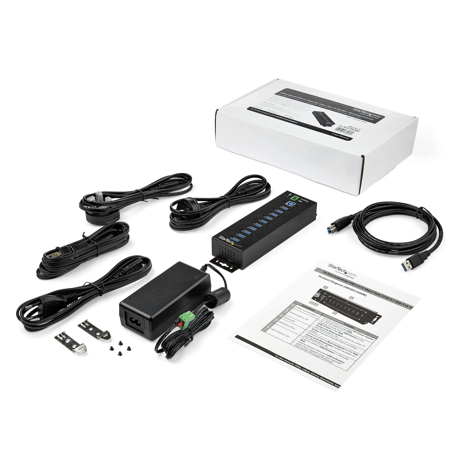 StarTech.com 10 Port USB Hub w/ Power Adapter - Metal Industrial USB 3.0 Data Hub - Din Rail, Wall & Desk Mount USB 3.1 Gen 1 5Gbps Hub