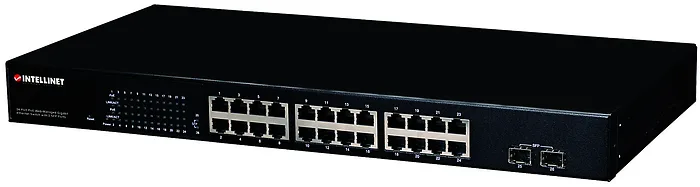 - 24-Port Gigabit Ethernet PoE/PoE+ Web-Managed Switch with 2 SFP Ports- The Intellinet 24-Port Gigabit Ethernet PoE+ Web-Managed Switch with 2 SFP Ports (560559) is designed to pass both data and electrical power to a number of PoE-compatible devices via standard Cat5e or Cat6 network cables. Equipped with 24 Gigabit Ethernet ports, all of which support 802.3at/af Power over Ethernet (PoE/PoE+), this switch can power Wireless LAN access points and bridges, VoIP (Voice over Internet Protocol) telephones, IP surveillance cameras and more while delivering network speeds of up to 1000 Mbps.- Provides power and data connection for up to 24 PoE network devices- Save installation cost by delivering data and power over existing network cables- 10/100/1000 auto-sensing ports automatically detect optimal network speeds- Two small form-factor pluggable GBIC module slots (SFP)- IEEE 802.3at/af-compliant RJ45 PoE/PoE+ output ports- Power output up to 30 watts per port*- PoE power budget of 240 watts- Supports IEEE 802.3at and IEEE 802.3af-compliant PoE devices (wireless access points, VoIP phones, IP cameras)- Supports IEEE 802.3at/af detection and short circuit, overload and high-voltage protection- All RJ45 ports with Auto-MDIX and NWay auto-negotiation support- Web-based configuration- Supports SNMP management- Supports VLAN (tag-based and port-based)- Provides IEEE 802.1x port-based security- Supports link aggregation (trunking)- Supports bandwidth control per port- Supports port mirroring- Supports two types of QoS: port-based and DSCP- Broadcast storm control with multicast packet rate settings- Supports jumbo frames up to 9 kBytes- Supports Rapid Spanning Tree/Spanning Tree protocol- Store and forward switching architecture- Full/half duplex operation- IEEE 802.3x flow control for full duplex- Supports 8k MAC address entries- 512 kBytes buffer memory- LEDs for power, link/activity and PoE- Two high-volume cooling fans ensure perfect ventilation- Includes 19" rackmount brackets-Three-Year Warranty2.3x