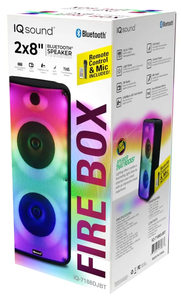 Enjoy a captivating FIRE LIGHT SHOW as colorful LED lights dance and change to the rhythm of your music. With multiple connectivity options including USB, Micro SD, and AUX inputs, you can easily connect your non-Bluetooth audio devices. It also includes an FM radio, a mic input, and comes with a remote control and one wired microphone.