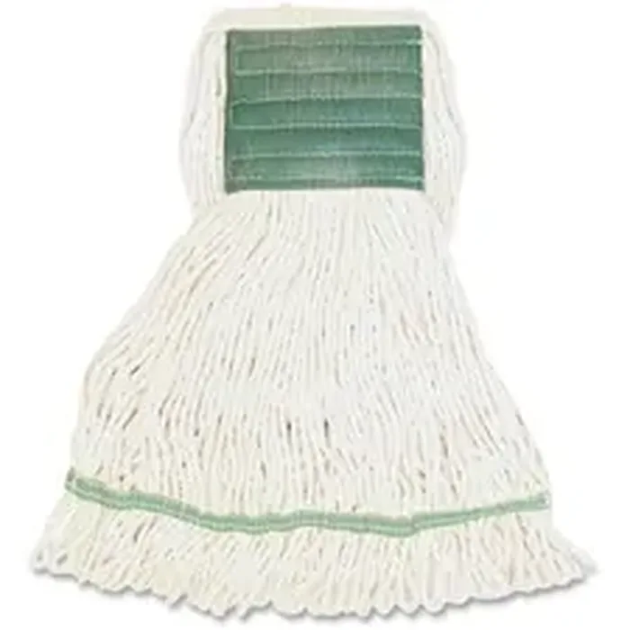 Medium-size mophead with a wide headband is ideal for general cleaning and disinfecting. Synthetic blend fibers (rayon and cotton) absorb six to seven times their weight. Mop offers a limited break-in period so you can start mopping sooner. Looped ends provide greater durability and launderability. Wide headband allows added launderability and use with all handle styles. 5" mesh headband with "S" zig-zag stitch pattern provides a more durable headband.