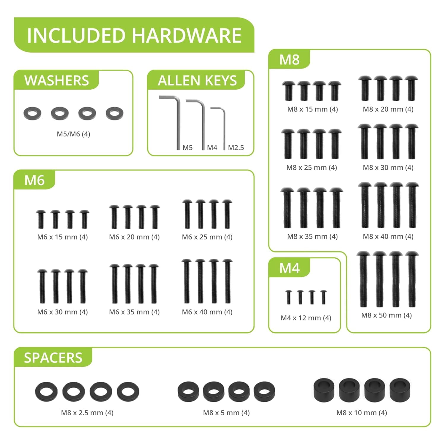 BOLT-KIT includes all the bolts, spacers, and washers needed to attach a TV to a mount. This universal TV screw kit simplifies installation by providing a variety of TV bolt sizes to ensure compatibility with nearly any TV. Neatly organized in a fully recyclable cardboard box, BOLT-KIT cuts down on waste and allows you to reuse your existing TV mount keeping. BOLT-KIT is a sustainable solution that eliminates the hassle of having to source the correct hardware for your screen and TV mount. UNIVERSAL Intended to work with nearly all TVs and TV mounts regardless of size or brand. EVERYTHING YOU NEED Comes with spacers, M4, M6, and M8 bolts in a variety of lengths to ensure full compatibility. ORGANIZED Screws and spacers are neatly displayed in a cardboard box keeping you organized during installation. ECO FRIENDLY Cut waste with fully recyclable packaging while reusing your old TV mount.