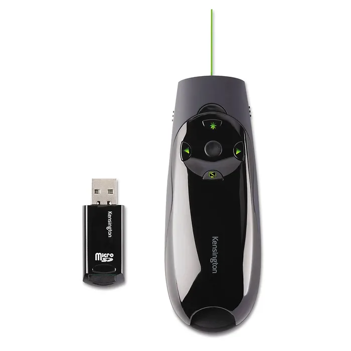 Make your point with this bright green wireless laser presenter that?s suitable for even the biggest rooms and brightest screens. It?s ten times brighter than standard red lasers, so it stands out against even the brightest LCD and plasma displays. Its intuitive four-button design makes it easy to navigate. When you need to move your cursor, a quick flip of a button gives you full cursor control. The powerful remote resists interference and lets you control Keynote or PowerPoint from up to 150 feet away.