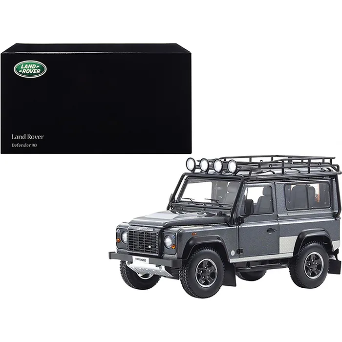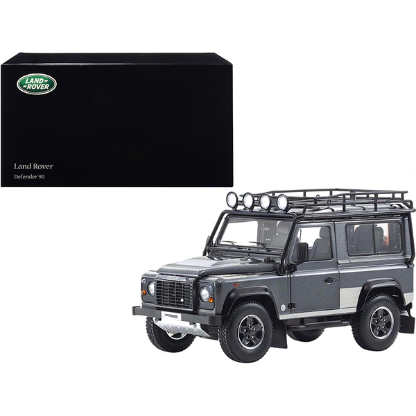 - Brand new 1/18 scale diecast car model of Land Rover Defender 90 with Roof Rack Dark Gray Metallic with Black Top and Chequer Plates die cast model car by Kyosho.