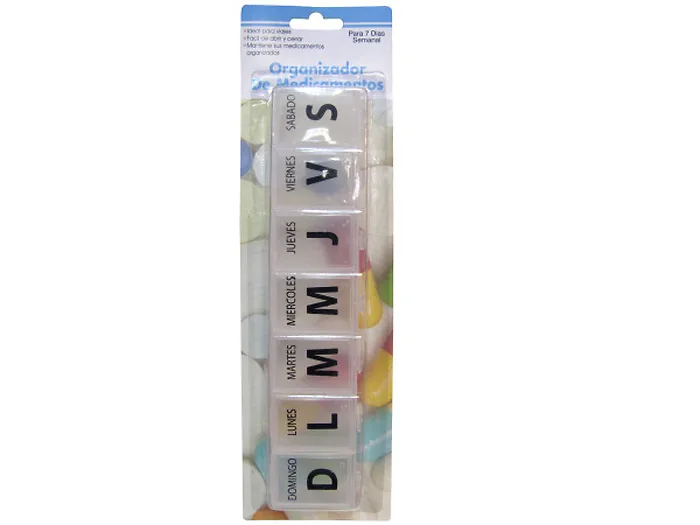Ideal for the patient who needs Spanish language reminders, this Large 7-Day Pill Box will hold a good number of pills and organize them so they are taken on the right days. Seven different sections are each marked with a day of the week. Measures approximately 9" x 2" x 1". Comes packaged in a blister pack.