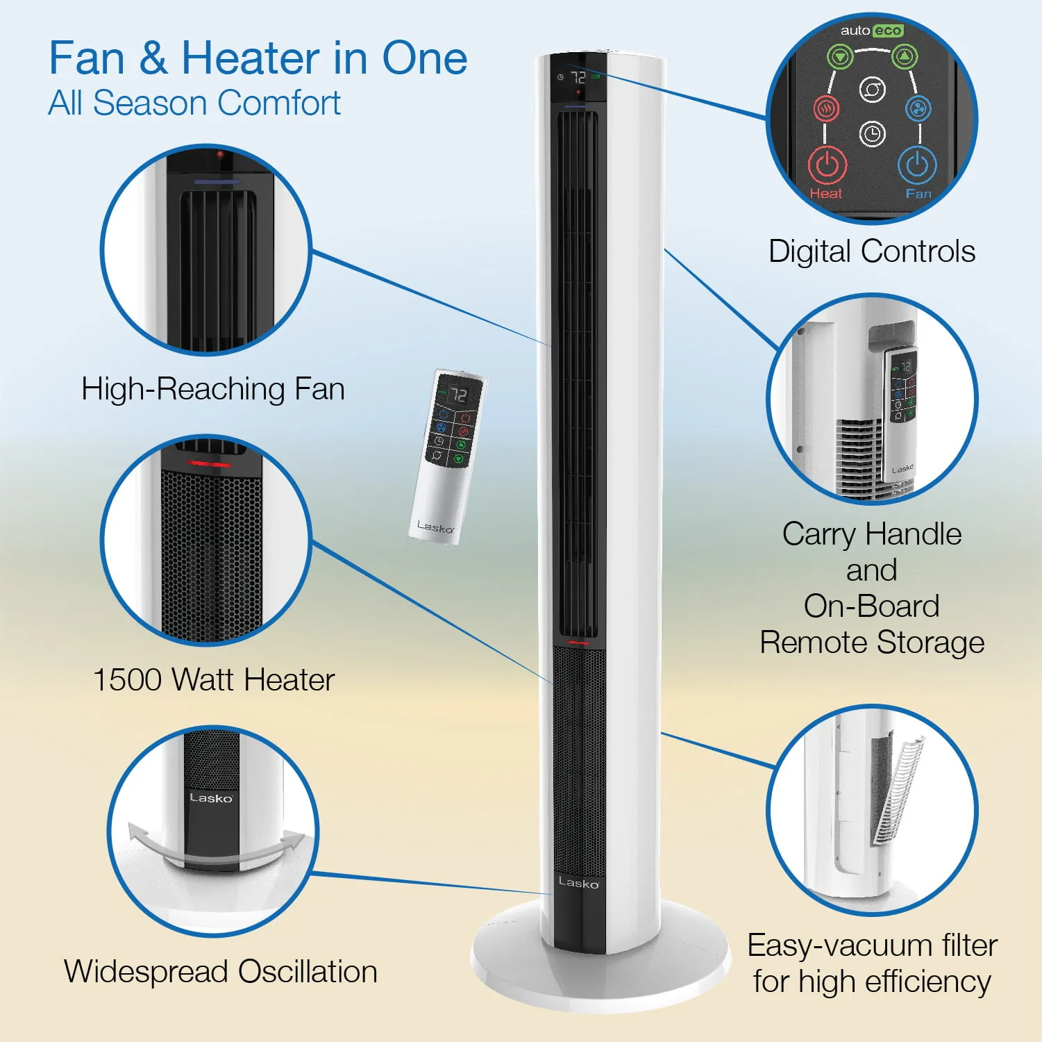 The Lasko FH500 is a versatile hybrid tower designed to provide year-round comfort. As both a fan and a heater, it's perfect for any room in your home, whether it's the bedroom, living room, basement, kitchen, garage, home office, or dormitory. With a powerful 1500-watt ceramic heater featuring 3-speed settings and 4 quiet fan speeds, this award-winning unit ensures a warm atmosphere during cold winters while effectively circulating air during hot, humid days.
