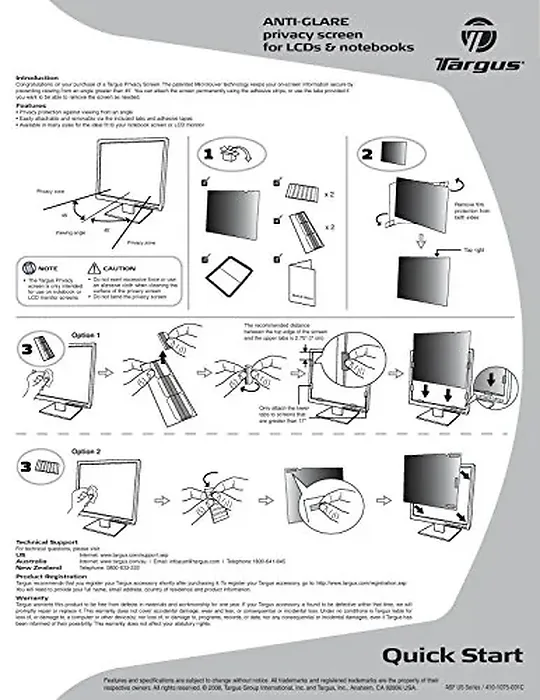 The Targus Privacy Filter is designed to fit 24" widescreen LCD monitors with 16:9 ratio screens. To protect your information, tiny vertical blinds on the surface of the privacy screen narrow the viewing angle so data is only visible directly in front of the monitor up to 45 degrees away from the center of the screen. Onlookers will only see a dark unclear screen when attempting to view the information from a side angle. In addition to providing security, the screen also blocks the glare to help reduce eye strain. The Targus Laptop Privacy Screen can be easily attached by using clear adhesive strips designed for LCD filters or with the included tab guides that stick to the edge of the LCD bezel to hold the screen in place. Users can also position the tabs so the screen easily slides on and off. Highly portable and easy to use, the Targus Privacy Screen prevents onlookers from viewing valuable information viewed on a laptop or LCD monitor.