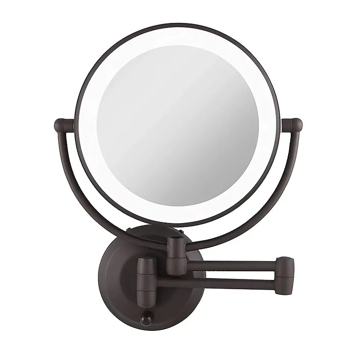 - Compact and cordless construction to easily mount it anywhere, without messy wires to hide- Use the full-view 1X side for everyday grooming, and the powerful 10X magnification side to zoom in on details- Vivid surround LED lighting evenly illuminates your entire face- Switch effortlessly between each magnification side with the 360r endless mirror head rotation- Product dimensions: 11.5 in. x 3 in. x 14.5 in.- Designed in the USA; 4 C batteries required (not included); oil-rubbed bronze finish- Uses 4 C batteries (not included)