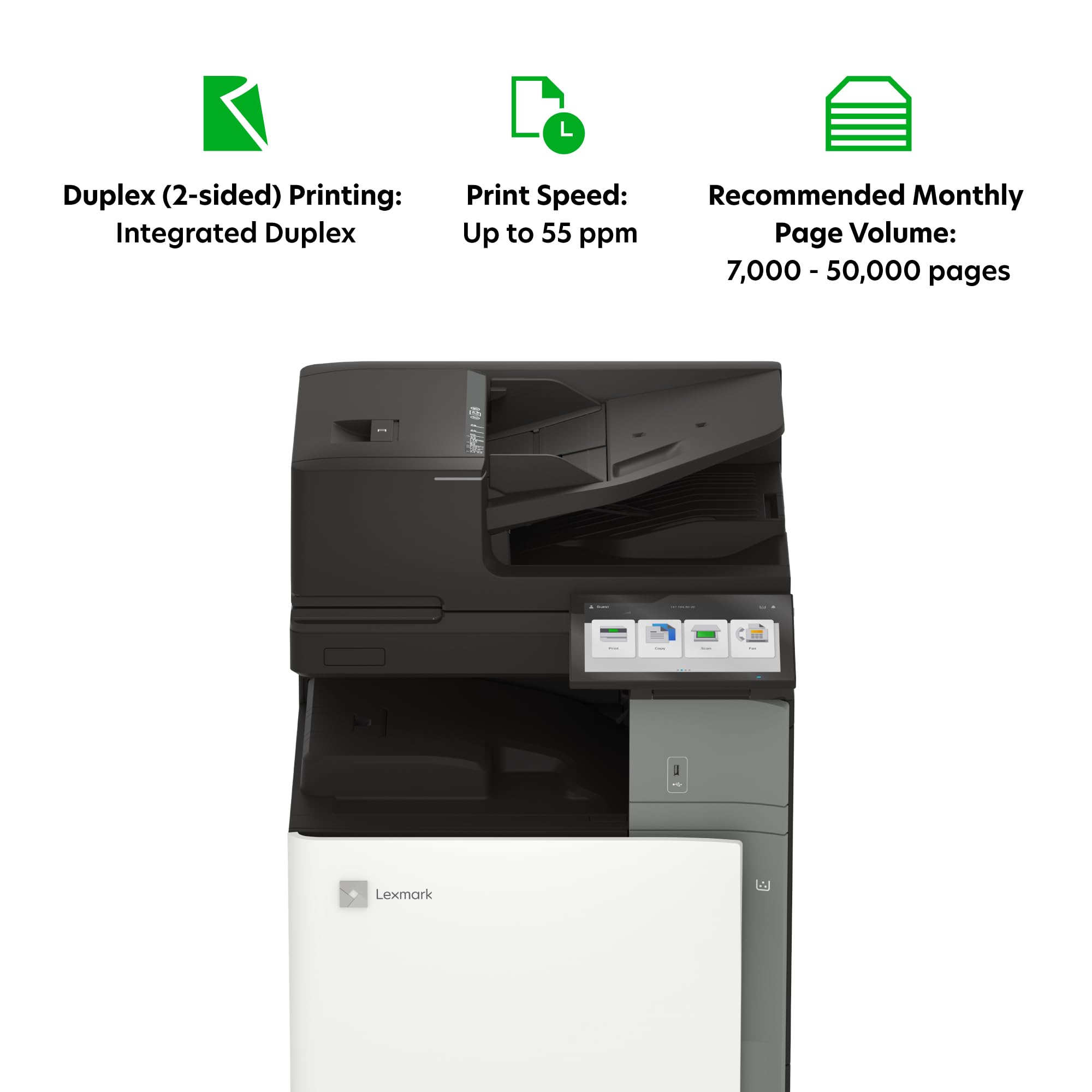 - Print speed: Up to 55 ppm